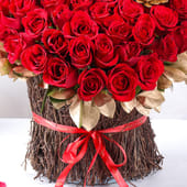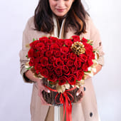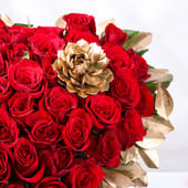 A stunning display of passion and elegance, this bouquet features lush red roses arranged in a heart shape and complemented by golden-sprayed Eichveria and delicate roots. The soft, gold accents bring a luxurious touch to the rich red blooms, while the cascading green leaves frame the entire arrangement. The charming golden flower adds an extra layer of sophistication, making it a perfect gift for occasions that celebrate love. Ideal for anniversaries, Valentine's Day, or to convey deep affection, this bouquet is a powerful symbol of love and devotion, capturing the romance in every petal.