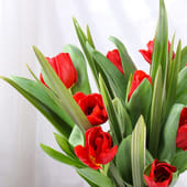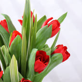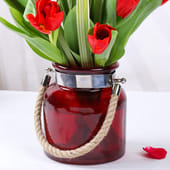 Radiant Red Tulips bloom elegantly in a striking red jar, accented with a rustic rope handle for a touch of charm. Symbolising love and passion, the vibrant tulips make a bold, romantic statement. Perfect for expressing affection on special occasions, the red jar complements the blooms, offering a unique, heartfelt gift. Perfect for romantic occasions, like anniversaries, Valentine’s Day, celebrating a milestone, or an unexpected gesture of love, this arrangement is an enchanting way to show someone just how much they mean to you. Price Breakup: Red Tulips In A Rustic Embrace ₹6395, Glass Vase ₹150