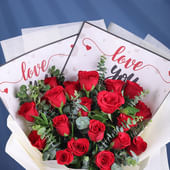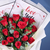 A classic expression of passion and devotion, this bouquet features twenty red roses paired with fresh sprigs of eucalyptus for a refreshing contrast. Each rose radiates timeless elegance, its deep crimson hue symbolising heartfelt emotions. Wrapped gracefully in white paper and finished with a “Love You” card, this bouquet is more than a gift—it’s a declaration of affection. Perfect for anniversaries, proposals, or romantic surprises, it captures the essence of love in its purest, most enchanting form.
