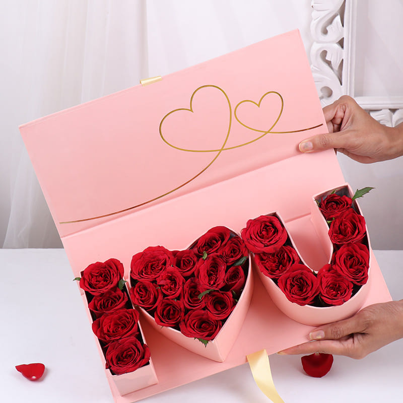 Say "I Love You" in the most beautiful way with this charming "I Heart You" box. Inside, 24 deep red roses are artfully arranged to spell "I" and "U," symbolizing your affection. The pink box is adorned with delicate gold hearts and a ribbon, adding a touch of sophistication to this romantic gift. Whether for Valentine's Day or any occasion that calls for love, this exquisite arrangement of Valentine roses will make the moment unforgettable.