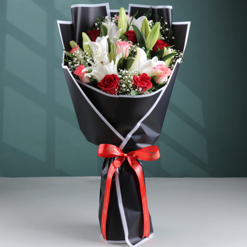 A premium bouquet combining red roses, pink roses, and white lilies wrapped in luxurious black paper. Elegant, fragrant, and full of presence, it’s ideal for anniversaries, events, or meaningful occasions. A royal-themed floral gift designed to impress and delight.