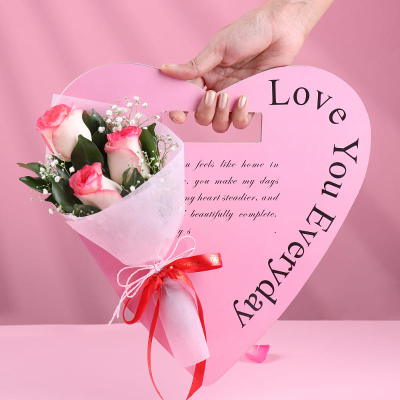 Celebrate love on occasions like Valentine's Day with this exquisite gift featuring three pink roses elegantly arranged in a designer heart-shaped flap. The blooms exude beauty and tenderness, while the packaging adds a thoughtful and romantic touch. Adorned with a delicate ribbon, this floral masterpiece symbolises love and affection, making it the perfect gift for your special someone. This thoughtful arrangement will surely bring a smile and make the occasion even more memorable. It’s the ideal way to say, “Love You Everyday.”