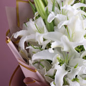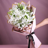 A bouquet that exudes timeless sophistication, this arrangement of 8 white lilies is pure elegance wrapped in charm. Each bloom radiates serenity and grace, symbolising peace, purity, and heartfelt emotions. Nestled in delicate pink premium paper and tied with a sleek black ribbon, the contrast creates a refined and striking look. The gentle fragrance of lilies elevates its appeal, making it a perfect gift for anniversaries, weddings, or meaningful celebrations. More than flowers, this bouquet is a poetic gesture of love and admiration, leaving an impression as lasting and beautiful as the blossoms themselves.