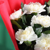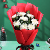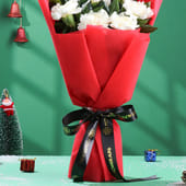 A truly enchanting gesture, this bouquet of pristine white gerberas is elegantly wrapped in vibrant red non-woven paper and tied with a sleek black ribbon. The contrast of the fresh white gerberas against the bold red wrapping creates a stunning visual, symbolising purity and joy, making it an ideal gift for celebrations, anniversaries, or a simple expression of admiration. The soft yet striking presence of these blooms evokes a sense of warmth and sincerity, making this bouquet a timeless choice for occasions like Christmas, anniversary, and simple surprise moments.