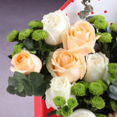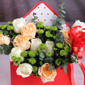 Feels like a warm hello, this stunning floral arrangement blends white and peach roses with green button daisies, all beautifully styled in a red envelope-inspired box with playful polka dots. A harmony of freshness and charm, it’s perfect for birthdays, thank-you gestures, or simply brightening someone’s day. Each bloom tells a story of calm, affection, and thoughtfulness. Designed to leave a lasting impression, this floral surprise is more than a gift, it’s a heartfelt message, delivered petal by petal.