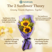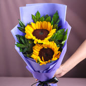 Bright and uplifting, this bouquet brings a burst of sunshine wrapped in soft purple tones. The two sunflowers stand tall and cheerful, their golden petals glowing against the calm, elegant non-woven paper. Fresh green leaves add fullness, creating a look that feels both vibrant and comforting. Whether you’re sending it to celebrate someone’s milestone or simply to lift their day, this bouquet blends warmth and charm in a way that makes every moment feel a little lighter and brighter.
