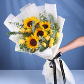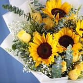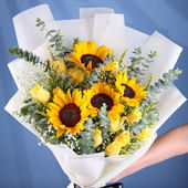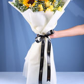 Bring sunshine into every moment with this radiant bouquet of golden sunflowers and delicate yellow roses, perfectly balanced with fresh eucalyptus leaves. Wrapped in crisp white non-woven paper and tied with an elegant ribbon, it’s a gift that speaks of warmth, cheer, and heartfelt wishes. Ideal for birthdays, celebrations, or simply brightening someone’s day, this floral arrangement captures the essence of joy and positivity. Each bloom is handpicked, ensuring that the bouquet not only dazzles at first sight but also carries a sentiment of love, light, and genuine happiness.