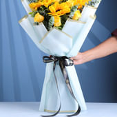 This stunning bouquet brings the warmth of the sun into any room, with a beautiful mix of vibrant sunflowers and delicate yellow roses. Handpicked for their beauty, the sunflowers radiate energy and positivity, while the yellow roses add a soft, romantic touch. The bouquet is elegantly wrapped in premium blue paper, adorned with a graceful ribbon and complemented by the freshness of eucalyptus, creating a truly refreshing look. Perfect for expressing joy, admiration, or simply brightening someone's day, this flower arrangement is a perfect blend of cheer and elegance.