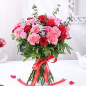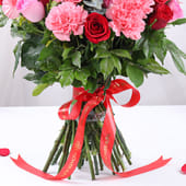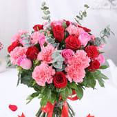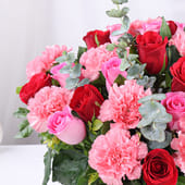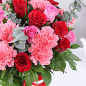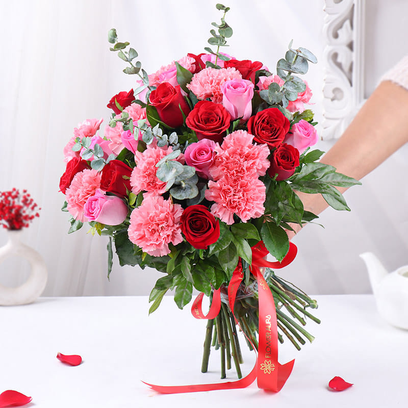 The deep red Valentine roses, full of passion, weave through the soft, revival pink roses that speak of admiration and deep affection. Light pink carnations add a tender touch, their delicate ruffles reflecting the gentleness of your feelings. Sprigs of eucalyptus bring freshness, their silvery leaves a soft contrast to the blooms' vibrant colours. Tied with a ribbon, this bouquet is a beautiful expression of romance. The perfect way to show someone they are truly cherished.