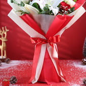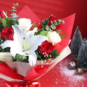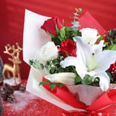 A striking blend of colour and elegance, this arrangement pairs three red roses with three white roses to create a beautiful contrast. A stunning white lily sits at the centre, adding a graceful, eye-catching touch. Eucalyptus and lush greenery bring texture and balance, enhancing the arrangement’s natural beauty. Wrapped in red and white paper with a matching ribbon, the bouquet carries a festive yet timeless charm. Perfect for Christmas gifting, heartfelt gestures, or conveying warm wishes, it’s crafted to leave a memorable impression.
