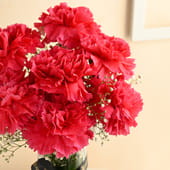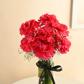 Elegantly arranged in a sleek glass vase, this stunning display of 7 vibrant pink carnations embodies admiration and grace. The lush green leaves and delicate white baby's breath fillers perfectly complement the striking pink blooms, creating a visual masterpiece that brightens any room. Ideal for Mother's Day, birthdays, housewarmings, or as a gesture of appreciation, this vase arrangement is a symbol of love and admiration. The minimalist glass vase adds a modern touch, making this arrangement not only a gift but also a lasting decorative piece for any space. Price Breakup: Timeless Pink Carnations ₹545, Glass Vase ₹150