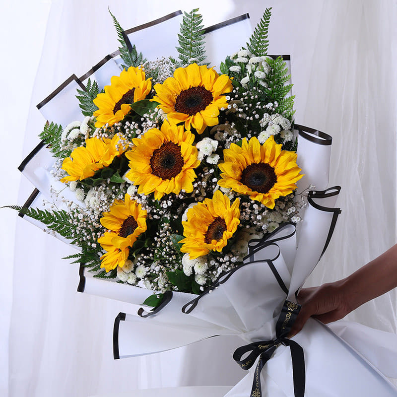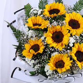 This Valentine's bouquet is made for a love that feels warm, steady, and real. Golden sunflowers surrounded by soft white accents and airy gypsos add a sense of ease. Eucalyptus and fern leaves weave through the arrangement, grounding it with freshness and calm. It is a gift for the person who makes ordinary days brighter and shared moments lighter. Wrapped with care, it suits smiles that linger and love that feels safe and sure. Give it as a reminder that romance is not always dramatic. Sometimes it is simply choosing each other, again and again, with warmth, honesty, and a hopeful heart.