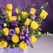 Radiating charm and elegance, this arrangement pairs golden yellow roses with regal purple eustoma for a striking contrast of warmth and depth. Blue daisies add a gentle touch of serenity, while sprigs of eucalyptus bring freshness and structure to the design. Set in a refined purple premium box and finished with a ribbon accent, the bouquet feels both vibrant and luxurious. A perfect choice to convey joy, admiration, and heartfelt wishes, making it ideal for grand celebrations or simply brightening someone’s day with a touch of radiant sophistication.