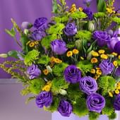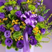 Canvas of colours unfolds with white carnations standing for purity, purple eustoma echoing elegance, and blue daisies bringing a serene calm. Sprinkled among them, bright yellow button daisies shine like tiny suns, adding joy and playfulness. Each bloom is thoughtfully arranged in a premium lavender box, finished with a satin ribbon that flows like a gentle stream. The contrast of vibrant hues against soft purples creates a bouquet that feels both lively and soothing. A gift that speaks of admiration, warmth, and heartfelt wishes, perfect for making someone’s day brighter and more memorable.