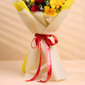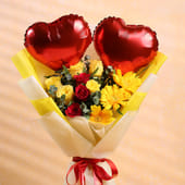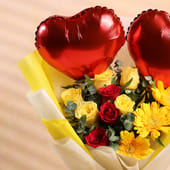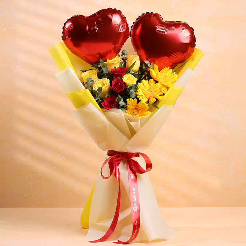 A vibrant bouquet that radiates joy and celebration! This stunning arrangement features 3 bold red roses, 5 cheerful yellow roses, and 3 lively yellow gerberas, beautifully wrapped in non-woven paper. Topping off this vibrant floral mix are 2 heart-shaped foil balloons, adding an extra touch of love and playfulness. Perfect for brightening someone’s day, this bouquet is ideal for birthdays, anniversaries, or any occasion that calls for a splash of colour and affection. A truly heartwarming gift to cherish.