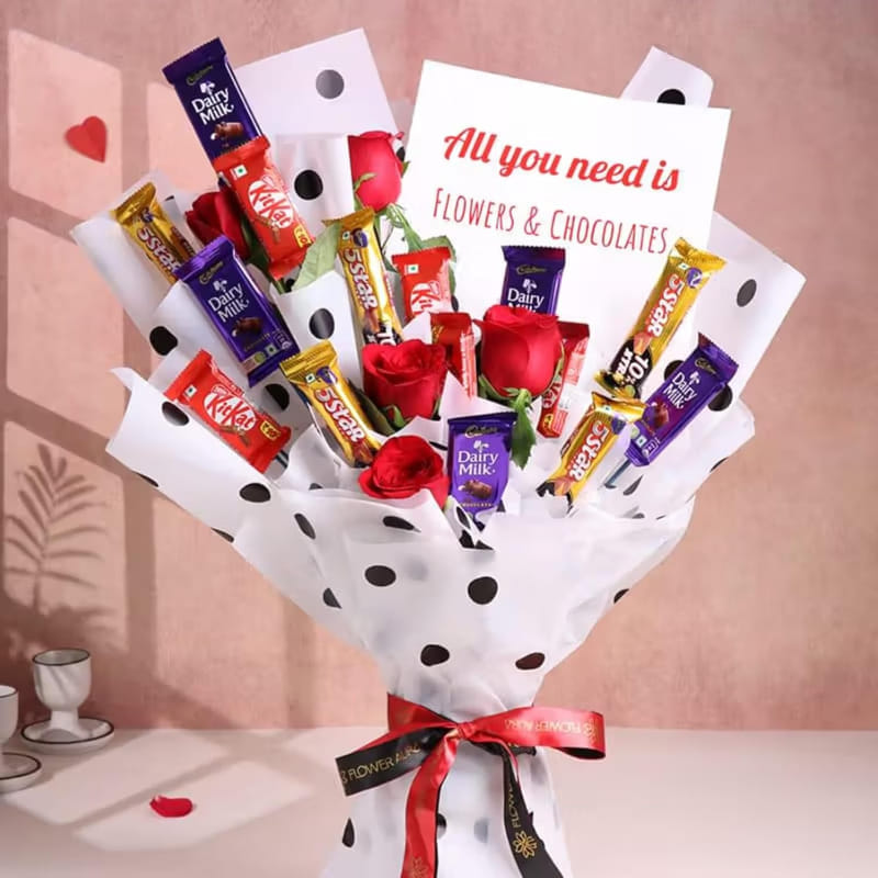 Five red roses paired with Dairy Milk, KitKat, and Five Star chocolates, wrapped in premium polka dot paper. A complete celebration gift for all occasions.