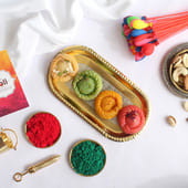 Celebrate the vibrant festival of Holi with this delightful gift box, featuring a mouthwatering assortment of Rose, Kesar, Pistachio, and Classic Chandrakala. Each sweet offers delicious flavours, bringing a burst of joy to your celebrations. Packaged in an elegant orange tin box, this special Holi edition comes with a heartfelt greeting card to spread cheer. The colourful presentation, paired with the festive sweets, makes it the perfect gift to share the spirit of the season with your loved ones.