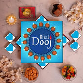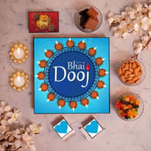 A box filled with warmth and meaning unfolds with almonds and mixed fruits nestled neatly alongside velvety chocolates that sweeten every sibling moment. At its heart lies a Tika set, complete with Roli, Chawal, Mishri, and Mauli, symbols of protection. The design carries festive charm with delicate motifs and heartfelt wishes inscribed within, making it more than just a hamper. Bhai Dooj is a reminder of the sacred promise between brother and sister, a celebration of protection, love, and togetherness, and this thoughtfully curated box captures that bond with grace and sentiment.