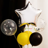 Celebrate your special one's birthday with this beautiful balloon stand. It includes a Silver Star Shape Foil Balloon, 2 Silver Confetti Balloons, 2 Yellow Latex Balloons, 2 Black Latex Balloons, 1 Happy Birthday Silver Foil Balloon and 1 Battery Light.