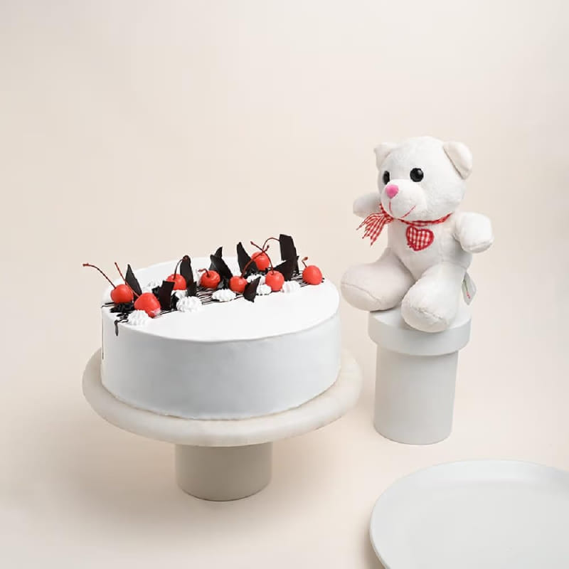 Experience pure indulgence with our exquisite combo of a scrumptious black forest cake and a fluffy 6-inch white teddy. The cake boasts a beautiful design, crowned with juicy red cherries, cream swirls, and luscious chocolate shavings. The teddy, adorned with a red ribbon and a heartwarming heart design, is the epitome of cuteness, complete with a charming pink nose. This luxurious yet adorable combo is the perfect gift for creating lovely moments and expressing your deepest affection. Surprise your loved ones on any special occasion with this delightful duo, and watch their faces light up with joy and appreciation.