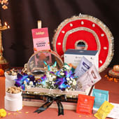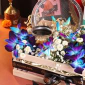 Celebrate the sacred bond of love this Karwa Chauth with a beautifully curated hamper. This stunning gift set includes a traditional Karwa Chauth Thali adorned with intricate details, along with a fine steel stainer and jar. Brighten up the occasion with blue orchids and white daisies, symbolising purity and peace. Indulge in gourmet delights like BBQ Almonds, Kalimirch Cashew, and the refreshing Floral Green Tea. Complete with Almond Rocks and all arranged in a sturdy wooden tray, this gift hamper offers a perfect blend of tradition, love, and indulgence.