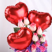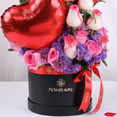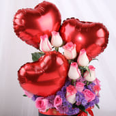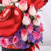 Celebrate love in all its beauty with this stunning floral arrangement featuring 3 red heart-shaped balloons, 12 pink roses, and delicate blue local daisies. Presented in a chic black box, this romantic creation is designed to evoke feelings of joy and affection. The striking red balloons add a playful touch, while the soft pink roses express tenderness and admiration. Perfect for celebrating Valentine’s Day, an anniversary, or simply expressing heartfelt emotions, this Valentine flower arrangement is a heartfelt gesture that combines elegance and charm.
