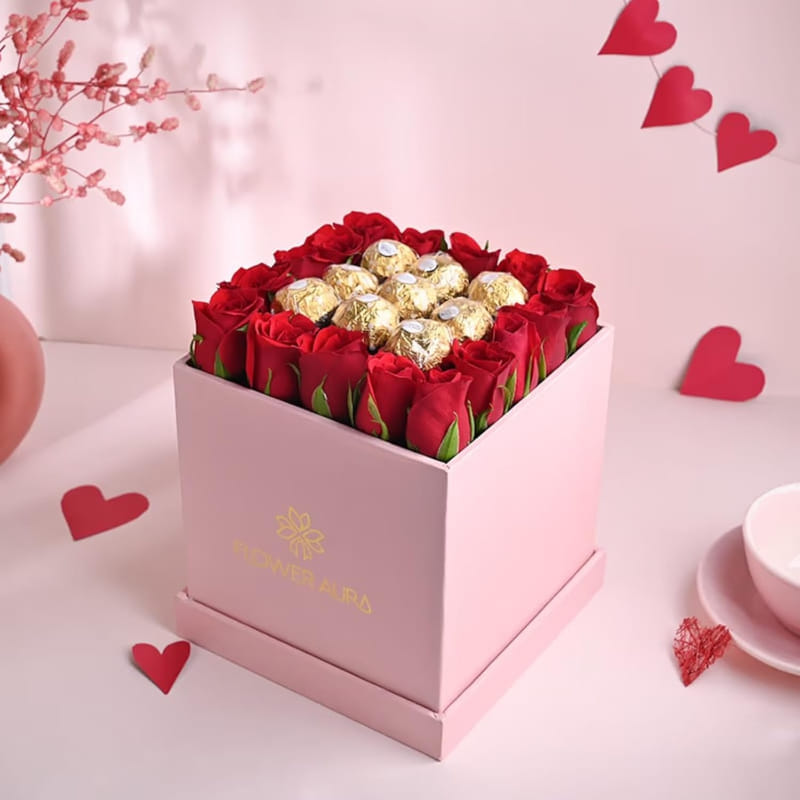 Fifteen red roses arranged in a premium pink MDF box with Ferrero Rocher chocolates. This modern floral box is perfect for romantic surprises and elegant gifting.