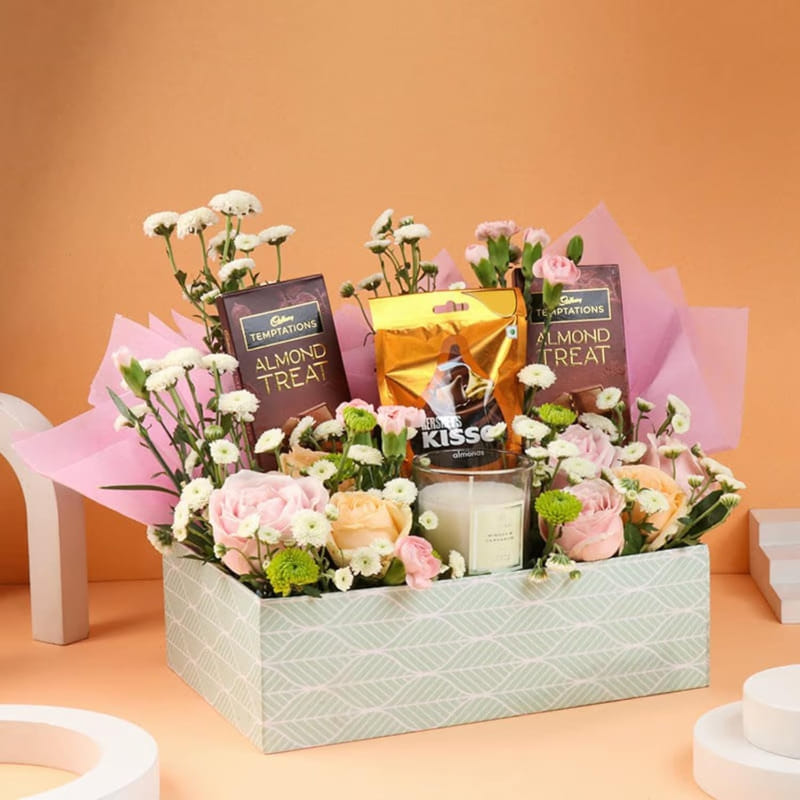 Indulge in the allure of this vibrant hamper, elegantly displayed in a stylish tray. This exquisite selection features peach roses, symbolizing appreciation and gratitude, complemented by the purity of white buttons and the subtle charm of spray carnations. The lively green buttons add a touch of playful vibrancy. Adding a sweet note are the temptations chocolate almond treats and classic Hershey kisses. A scented candle completes the ensemble, creating a warm, inviting ambiance. Wrapped with finesse, this hamper is an ideal gift, combining the beauty of flowers with delightful treats to express your heartfelt sentiments in the most elegant way.