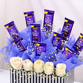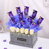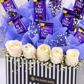 A perfect blend of sweetness and elegance, this gift box features 10 Dairy Milk bars and 5 pristine white roses, beautifully arranged in a premium black-and-white striped box. The combination of these elements creates a timeless expression of love and affection, making it ideal for special occasions like Valentine's Day. Whether you're celebrating love or surprising someone special, this gift is sure to leave a lasting impression. With its premium design and delightful combination, it's a thoughtful way to make any moment unforgettable.