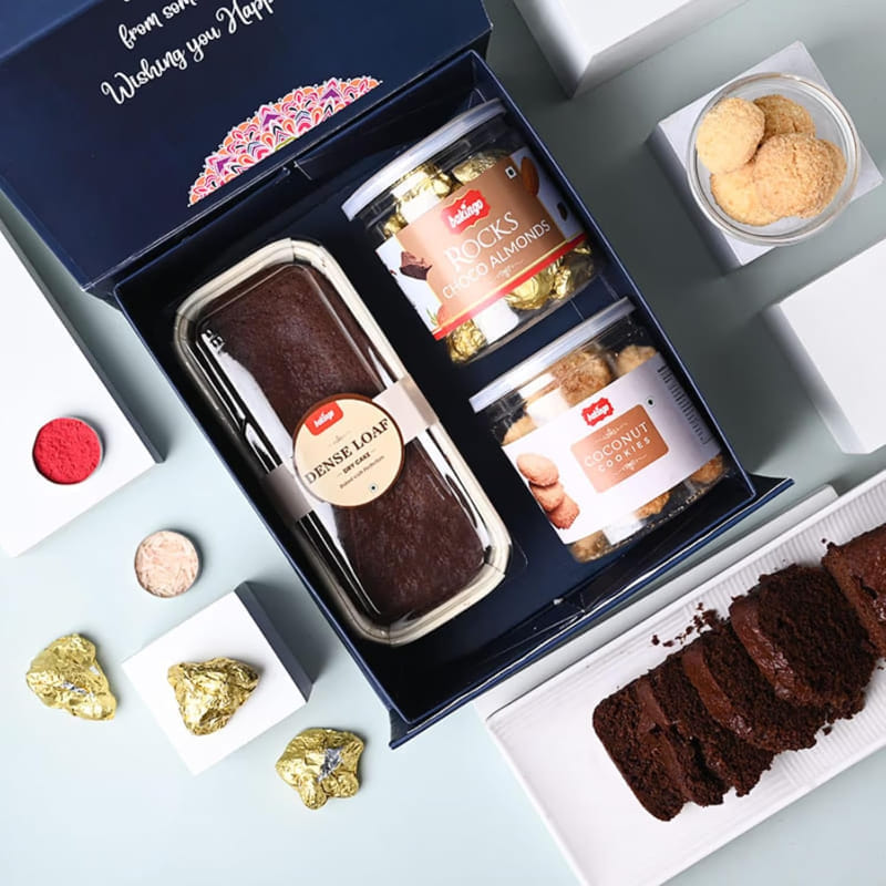 Delight your sibling with the epitome of love and sweetness this Raksha Bandhan with our exquisite hamper. Unveil the charm of heartfelt connections with a Bakingo & Walnut Dry Cake, the delightful Bakingo Rocks Choco Almonds in a Can Jar, and the scrumptious Bakingo Coconut Cookies in a Can Jar. All elegantly packaged in a beautiful FlowerAura Box, this hamper is a testament to your cherished bond. Embrace the spirit of love and affection with this thoughtfully curated ensemble, perfect for making the occasion memorable.