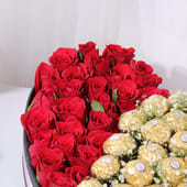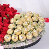 Indulge in a delightful blend of romance and luxury with this exquisite heart-shaped arrangement. Comprising half a box filled with red roses and the rest with Ferrero Rocher chocolates, this gift is a perfect fusion of beauty and sweetness. The deep red Valentine rose exudes love and passion, while the creamy, crunchy Ferrero Rocher chocolates add an irresistible touch of indulgence. Presented in a chic heart-shaped box, it’s a romantic gesture that’s sure to leave a lasting impression, making it ideal for anniversaries, Valentine’s Day, or any special romantic occasion.