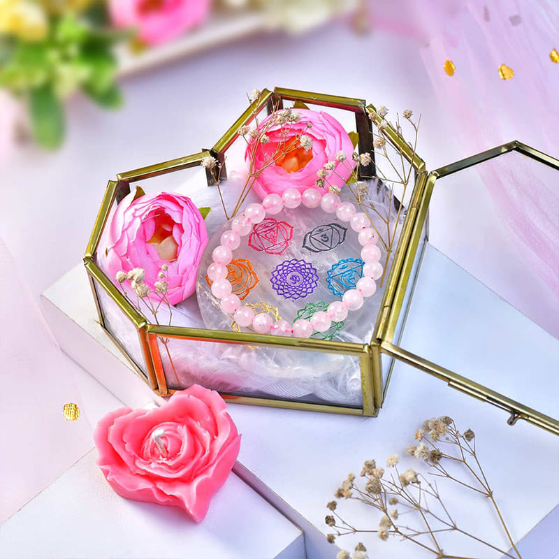 This beautifully crafted Heart-shaped Glass Jewellery Box is a perfect romantic gift for someone special. Inside, you'll find a Chakra Selenite Plate designed to charge your crystals and bring positive energy, along with a Certified Rose Quartz Bracelet, believed to attract love and promote harmony in relationships. The addition of two artificial decorative pink roses adds a touch of elegance and charm, making this set not just a gift, but a meaningful gesture of love. A ideal gift for an anniversary, Valentine's Day, or just to show you care, and a way to nurture and enhance positivity.