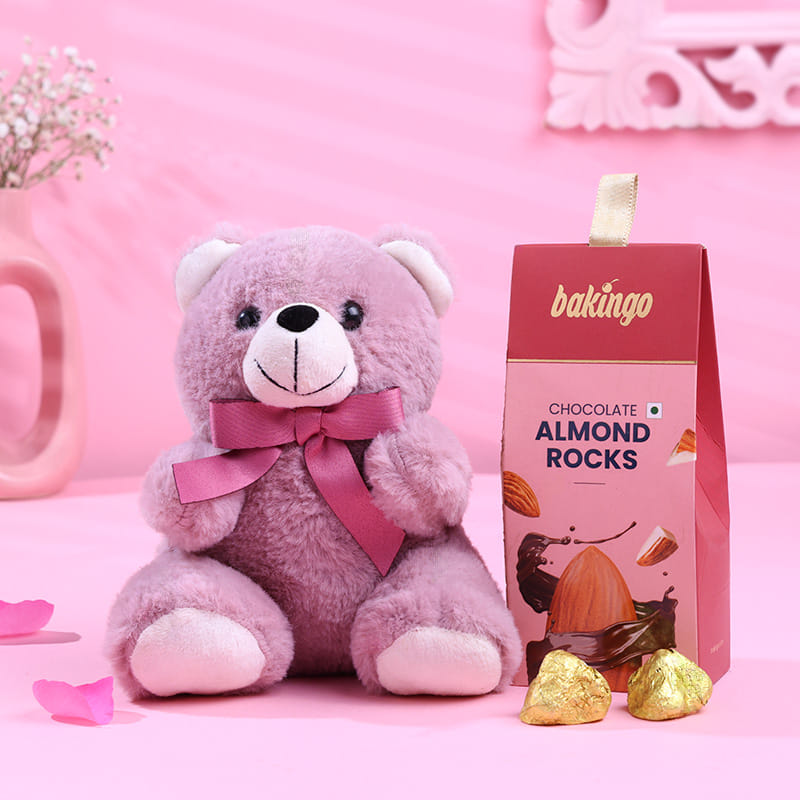 A delightful blend of sweetness and warmth, this gift combo includes a soft purple teddy bear paired with Bakingo's irresistible almond rocks. The teddy’s charming presence makes it the perfect companion for your loved one, while the treats offer an indulgent taste experience. Whether it's for Valentine’s Day or any other special occasion, this gift is sure to bring a smile to your loved one’s face and make the moment even more memorable.