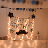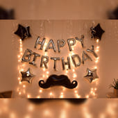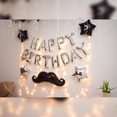 Brighten up any birthday celebration with this exquisite balloon decoration! This package features a charming "Happy Birthday" in shimmering silver letter foil balloons, adding a touch of elegance. Accompanying this are 2 sleek black and 2 shiny silver star-shaped foil balloons, along with a unique black moustache foil balloon for a playful twist. The set is further enhanced by an abundant mix of 150 balloons, including 50 each in sophisticated black latex, gleaming silver metallic, and deep dark blue metallic shades. To add a magical touch, the package includes a set of enchanting fairy lights, perfect for creating a festive and memorable atmosphere.