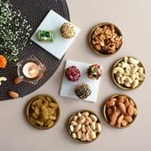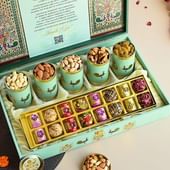 A festive gift box that blends elegance with indulgence, this Diwali hamper is designed to delight both the eyes and the taste buds. Inside, discover the richness of premium dry fruits – cashews, almonds, raisins, pistachios, and walnuts, paired with the sweetness of assorted gourmet Dryfruit Laddoos and handmade chocolates. Presented in a beautifully crafted box with intricate artwork, it carries the essence of tradition while adding a touch of luxury. Accompanied by a Diwali greeting card, this hamper is perfect for sharing joy, prosperity, and heartfelt wishes with loved ones.
