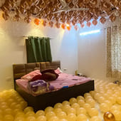 Turn any room into a dreamy celebration space with this elegant balloon decor setup. Featuring 100 rose gold chrome balloons suspended from the ceiling, with cascading silver ribbons, it creates a luxurious floating effect that instantly transforms the vibe. The floor is beautifully filled with 100 peach latex balloons, adding warmth and fullness to the setting. A Happy Anniversary or Happy Birthday banner completes the look, making it perfect for surprise celebrations, romantic moments, or intimate parties that deserve a soft, glowing, and memorable ambience.