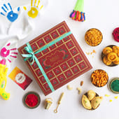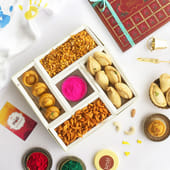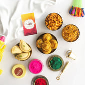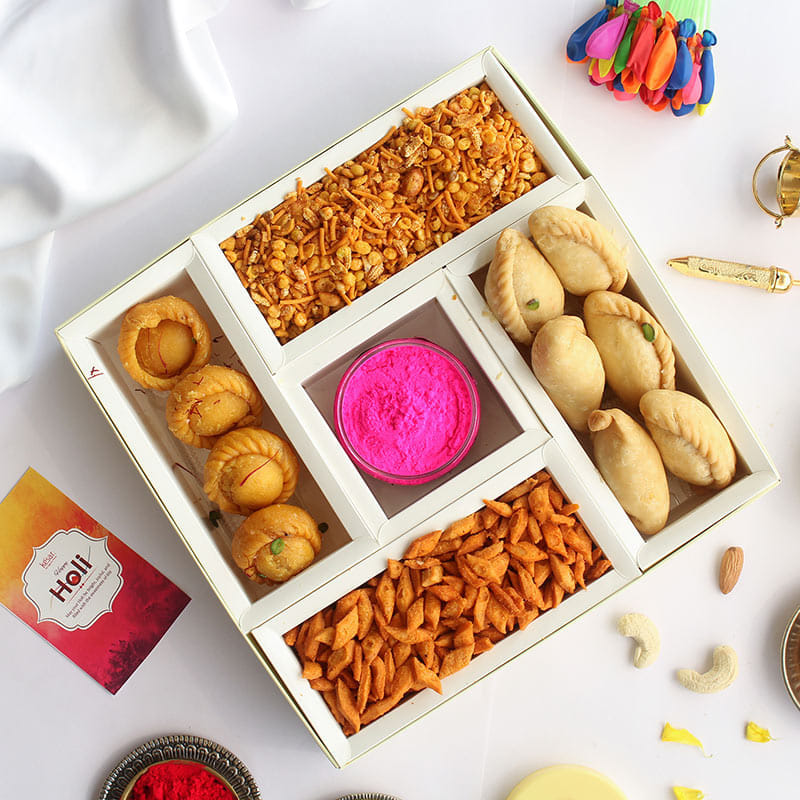Celebrate Holi with this delightful gift box, filled with an assortment of festive treats. Enjoy the crispy and delicious plain Gujiya, paired with two Kesar Chandrakalas, perfect for a sweet indulgence. The box also includes a Colour box for the playful side of the celebration, along with the spicy kick of chilly Namkeen and a crunchy Navratana mixture. All these mouth-watering goodies are elegantly packed in a vibrant red gift box, complete with a heartfelt Holi greeting card, making it the perfect gift for your loved ones this festive season.