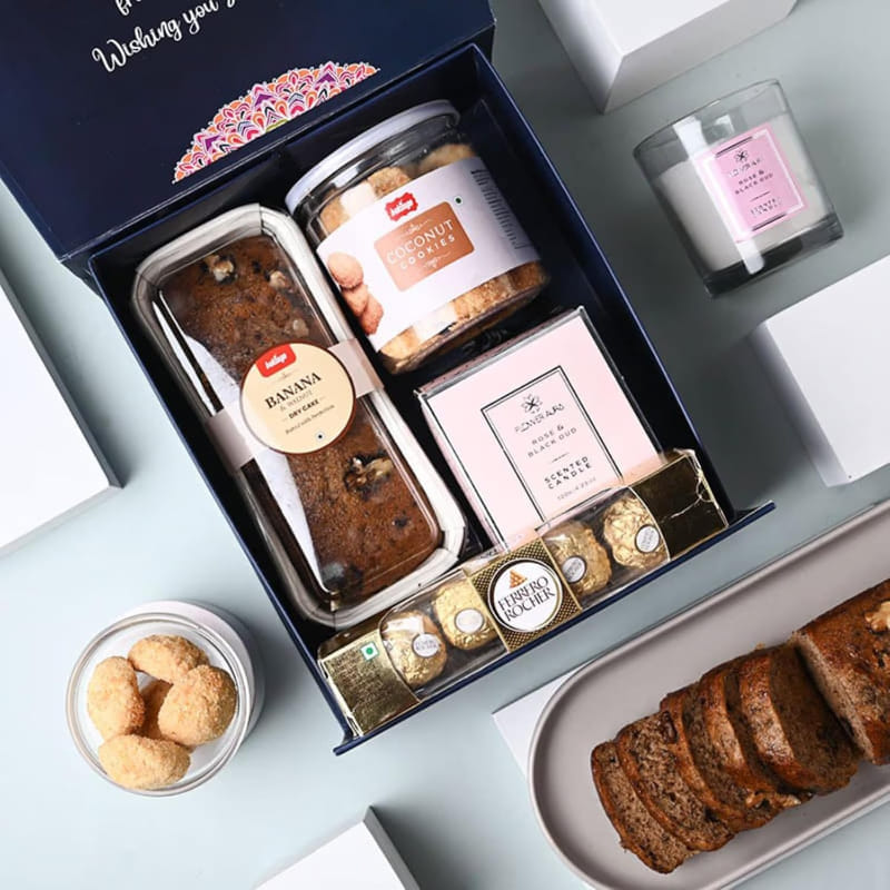 Elevate your Raksha Bandhan festivities with this exquisitely curated Rakhi Hamper, a symphony of love and affection. Delight in the decadence of a pack of four Ferrero Rocher chocolates, each bite a moment of pure bliss. Embrace the warmth of a rose & black oud scented candle, creating an ambience of serenity. Indulge in the wonderful taste of Bakingo's coconut cookies, a delightful treat for the tastebuds. Complete the experience with the rich flavors of a banana & walnut dry cake. Encased in a charming Floweraura box, this hamper is a testament to the eternal bond you share.