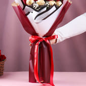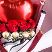 Here's a bouquet that speaks straight to the heart, blending romance and warmth. Five red roses add depth and passion, while five white carnations bring a soft, graceful balance. Two heart-shaped foil balloons sit beautifully within the arrangement, giving it a playful highlight that instantly catches the eye. Wrapped in premium paper with an elegant finish, this bouquet creates an experience that feels joyful and full of affection. It is the perfect surprise for your anniversary, Valentine's Day or other special moments.