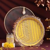 This yellow Karwa Chauth thaali, intricately designed with silver lace and traditional embroidery reflects devotion and elegance. Shringar essentials complete the ritual, while the glow of lotus diya holders adds a sacred charm to the setting. To sweeten the occasion, desi ghee besan laddoos bring the taste of festivity, paired with spiced kalimirch cashews, wholesome trail mix, and rich chocolate almond rocks for a modern twist. Each element carries the essence of Karwa Chauth—a celebration of enduring love, strength, and the timeless bond shared between partners.