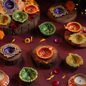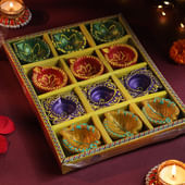 Illuminate your celebrations with this stunning set of 12 colourful designer terracotta diyas, each hand-painted with intricate detailing and festive hues. These diyas blend tradition with artistry, making them the perfect choice for adorning puja rooms, doorways, or living spaces. Their warm glow creates a divine ambience that captures the true spirit of Diwali and other auspicious occasions. Thoughtfully crafted, this set also makes a meaningful gift for friends and family, symbolising prosperity, joy, and togetherness. A radiant way to brighten homes and hearts during the festive season.