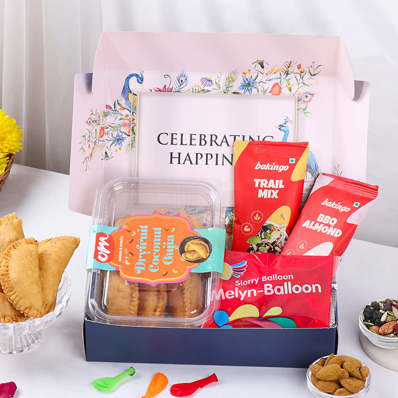 This Holi hamper brings together everything that makes the festival joyful, playful, and full of flavour. Inside this beautiful box, you will find dryfruit coconut gujiya, a wholesome trail mix, smoky BBQ almonds, and a water balloon packet for cheerful moments. Every element is chosen to balance tradition with fun, ensuring memorable festivities. It is perfect for gifting to family and friends or for keeping at home to enjoy the festival to the fullest. This thoughtful Holi hamper promises laughter, sweetness, and togetherness.