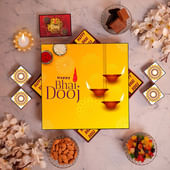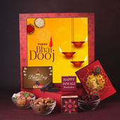 A Bhai Dooj gift box crafted to honour rituals and delight the senses. Presented in a festive red-gold design, it carries a medley of flavours to celebrate the bond of siblings. The crunch of premium almonds pairs beautifully with the sweetness of colourful mixed fruits, while tangy cranberries add a refreshing zing. Completing the box are rich chocolates, wrapped in elegant Bhai Dooj prints, offering indulgence in every bite. Thoughtfully curated with tradition and taste in mind, this box is more than just a present—it’s a heartfelt way to share joy, love, and festive cheer.