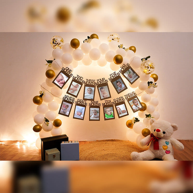 A charming balloon ensemble awaits to transform a first birthday into a golden affair! The gorgeous white and golden balloon setup exudes elegance, promising an unforgettable celebration. This resplendent decoration, curated with precision, serves as a perfect gift, symbolizing the joyous journey of the little one's first year. The golden accents signify prosperity and a bright future, while the pristine white balloons embody purity and innocence. Elevate the occasion with this delightful gift, where every balloon is a gleaming messenger of love and festivity, creating a magical ambiance for the special milestone.