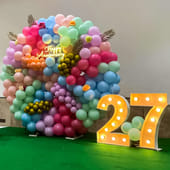 Give the anniversary celebration a bright and stylish twist with this pastel balloon ring setup designed to stand out beautifully. Decorated with theme-based pastel balloons, 20 to 30 golden chrome balloons, artificial grass, and flower bunches, this setup creates a lively and premium party backdrop. The glowing Happy Anniversary neon sign adds a warm focal point, while 3 metallic cake tables with elegant cage props enhance the display area. Numeric LED numbers complete the setup, making it perfect for milestone anniversaries and memorable photo moments.