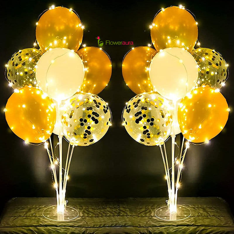Add fun and cheer to your parties with this classy and glowy balloon bouquet. It includes four golden chrome balloons, two confetti balloons, white latex balloon with a balloon stand. Plus, two battery LED lights to make it more sparkling. Buy this cmajestic balloon bouquet for your special occasions. Order Now!