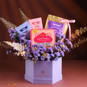 A box that feels like a celebration in itself, blending charm, flavour, and warmth in perfect harmony. The soft lilac blooms and golden ferns add a touch of grace, while the rich hues of the purple box speak of joy and abundance. Inside, a medley of delightful treats awaits. Crunchy trail mix, smoky BBQ almonds, and caramel-rich almond bark. The classic Kaju Katli rests at the centre, shining like a token of love and tradition. Thoughtfully put together, it’s a heartwarming gesture for every festive moment shared with family, friends, and the ones who make life feel brighter.