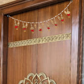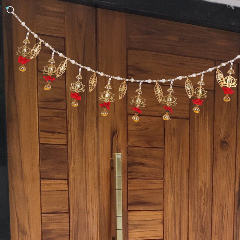 This decorative Toran is a graceful blend of tradition and beauty, designed to welcome positivity into your home. Featuring golden lotus and leaf motifs accented with delicate red floral touches, it creates an elegant contrast that catches the eye. Strung with pearl-like beads, the arrangement flows beautifully, adding charm to doorways, Pooja spaces, and festive corners. Perfect for Diwali, housewarmings, or celebrations, it symbolises prosperity and warmth. With its intricate detailing and rich appeal, this Toran instantly transforms any space into a welcoming haven.