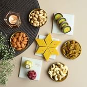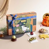 This luxe Diwali hamper brings together indulgence and tradition in one elegant box. Packed with a rich assortment of dry fruits – cashews, almonds, raisins, and pistachios, alongside festive sweets like Kesar Katli, Rose Petal Laddoo, Kaju Anjeer Chakkar, and Channa Shahi Badam Laddoo, it offers both variety and grandeur. Housed in a beautifully designed festive box and paired with a greeting card, it makes a thoughtful choice for gifting. Each element reflects richness, care, and the joy of togetherness, making this hamper perfect for sharing happiness during the festival of lights.