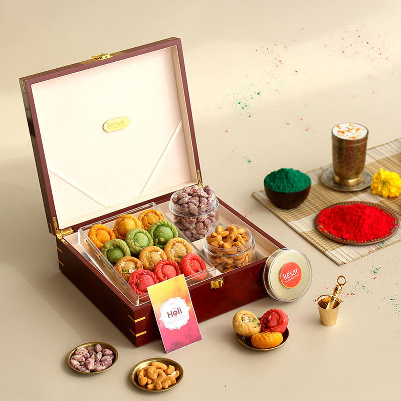This elegant Holi gift box is a perfect blend of festive sweetness and savoury indulgence. Inside, you'll find a delightful assortment of Assorted Flavoured Chandrakala, Rose Almonds, and Punjabi Tadka Cashews, offering a variety of textures and flavours to savour. All of these treats are carefully packed in a premium lacquer wooden gift box, accompanied by a festive Holi greeting card. It's an ideal gift to share the joy of Holi with loved ones and make the celebration even sweeter.